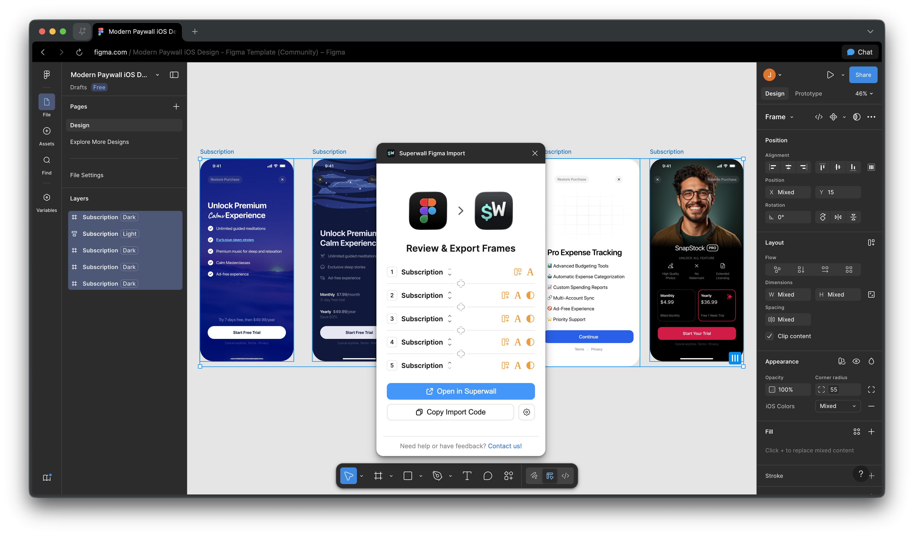 Once installed, you can select any frame and instantly import it to Superwall. Each component comes over individually, preserving your design structure and layer hierarchy. That means you no longer have to spend extra time exporting assets, or rebuilding layouts over again.