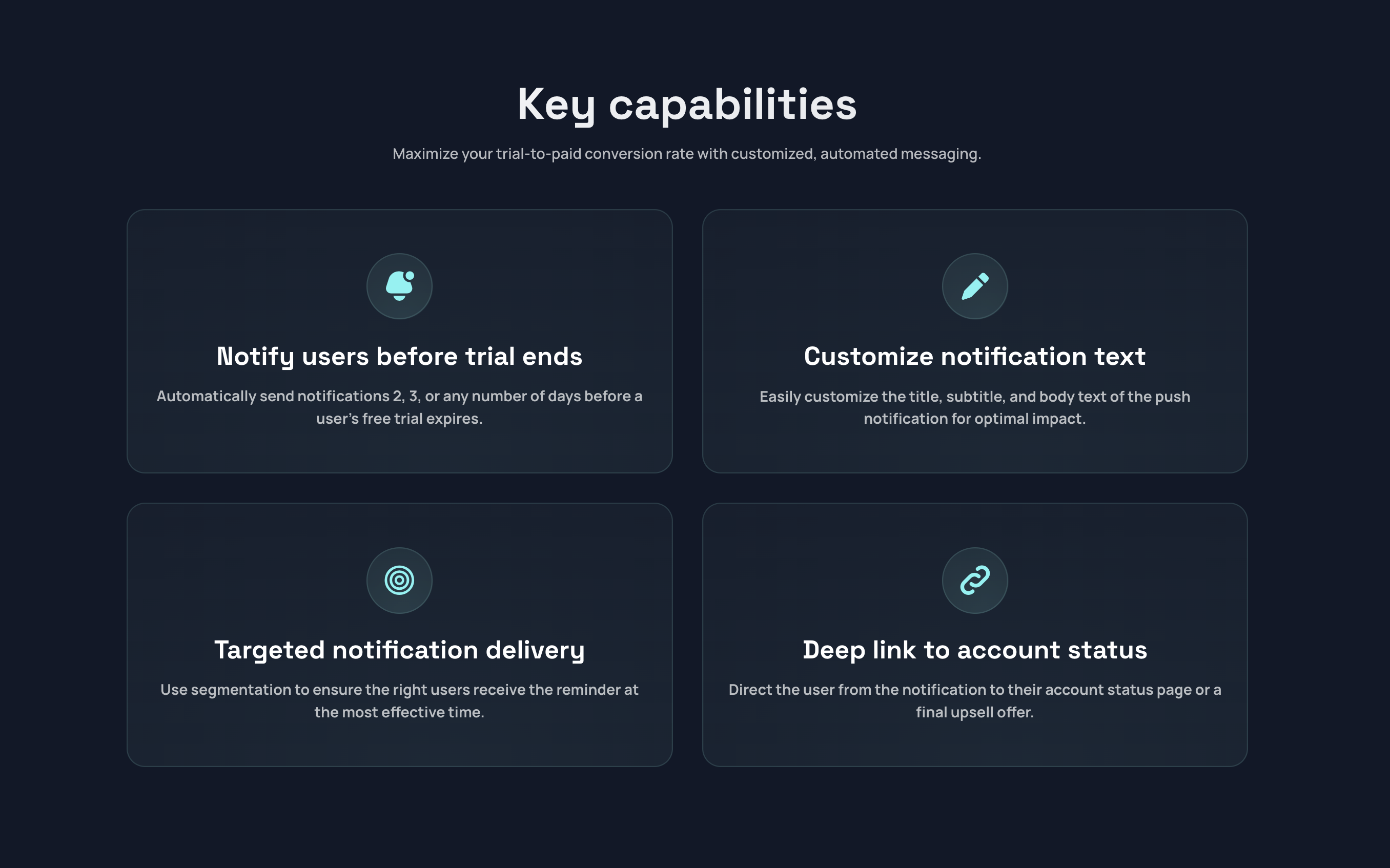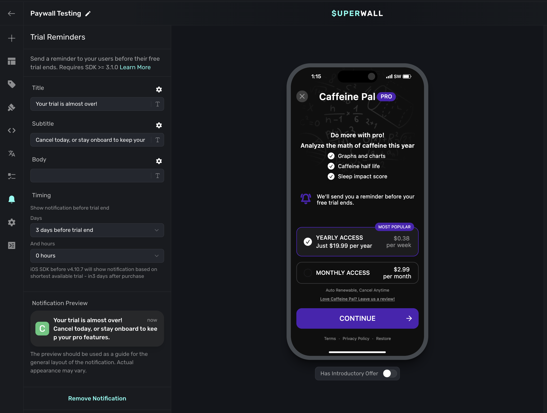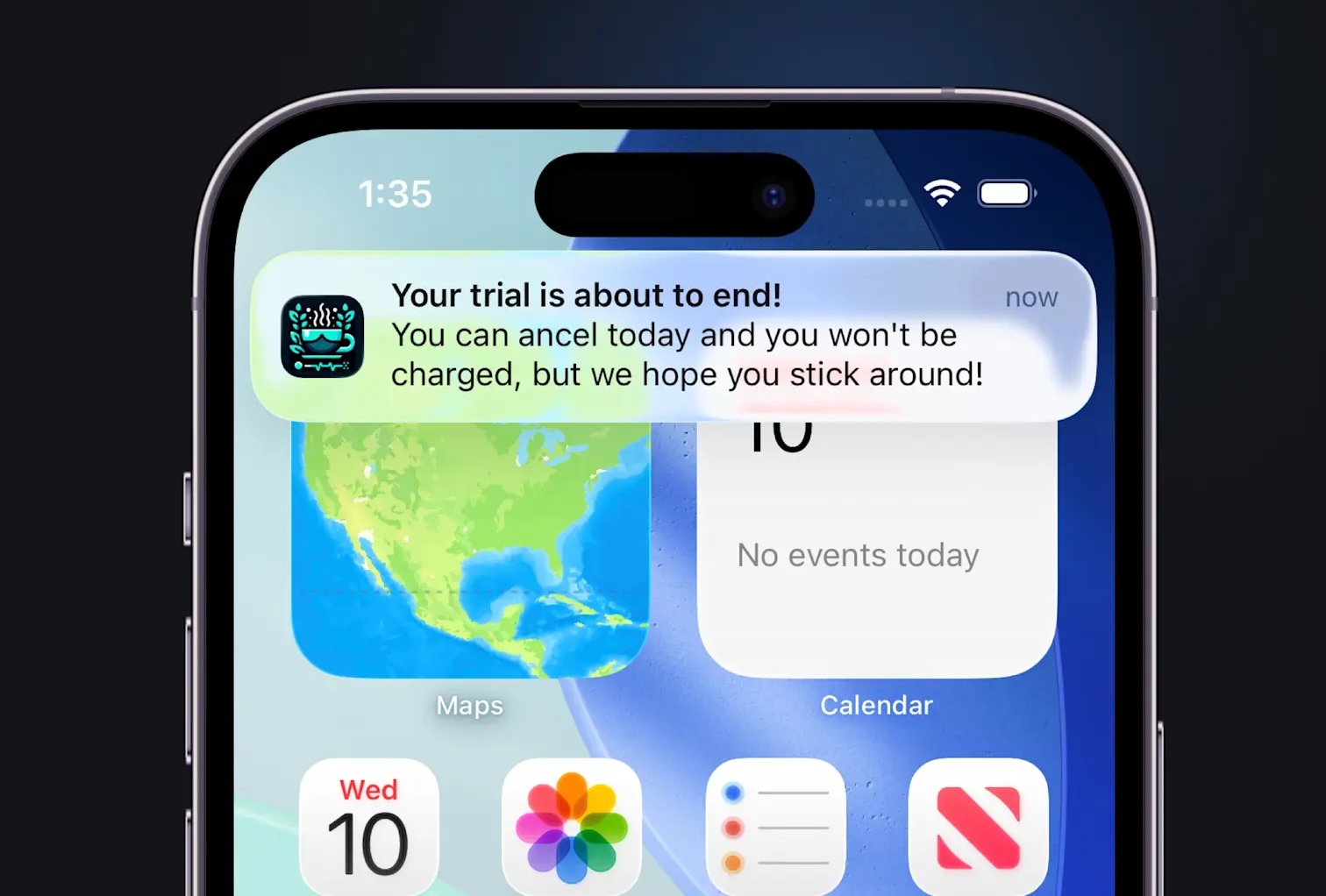 The idea is simple — the user will receive a push notification before their trial ends. This reminds them to either cancel the trial if they don't want to be charged, or stay onboard to keep their "pro" features. At Superwall, we've seen this work time and time again. It lets the user have some peace of mind about the trial terms, and it avoids the common friction point so many have with trials. That is, forgetting to cancel them if they aren't convinced to stick around.